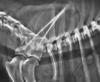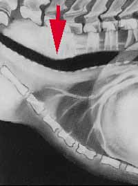 Aunque la razón exacta de por qué aparece esta enfermedad no se conoce, sí se sabe que la membrana dorsal degenera progresivamente y se introduce dentro de la luz de la tráquea impidiendo la entrada de aire hacia los pulmones (fotografía 5; Representación gráfica de una radiografía en proyección latero-lateral de un colapso tráqueal (flecha)).